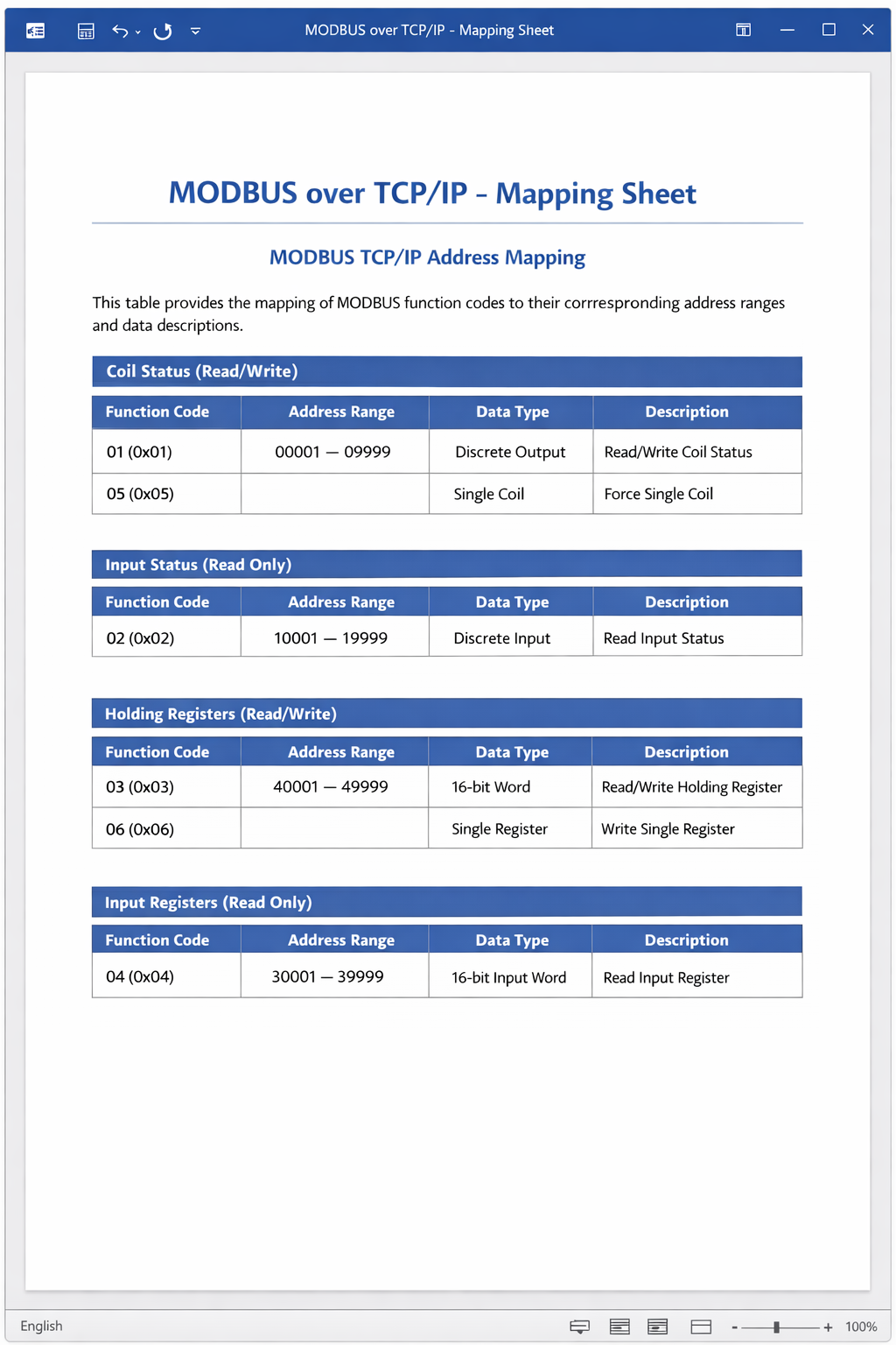 MODBUS over TCP/IP – MS Word Mapping Sheet Microservice